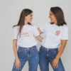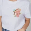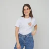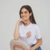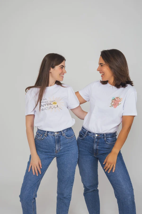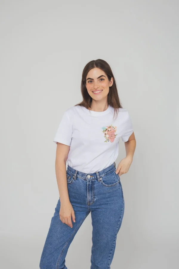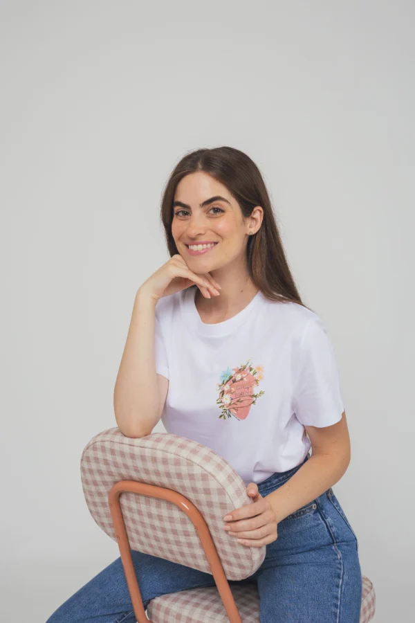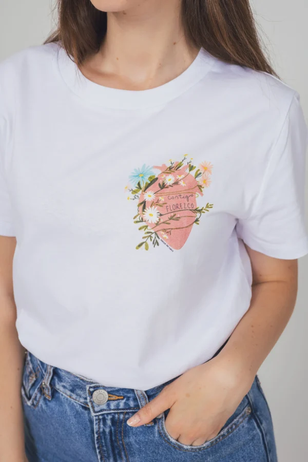 Camiseta Contigo Florezco para maestras, hecha en 100% algodón orgánico con gramaje de 180 g/m². Un diseño femenino y sostenible con un corazón que simboliza el cariño, la pasión y la dedicación que se ponen en la enseñanza. Ideal como camiseta de profesora, cómoda y con estilo atemporal. Disponible en tallas S, M, L y XL.