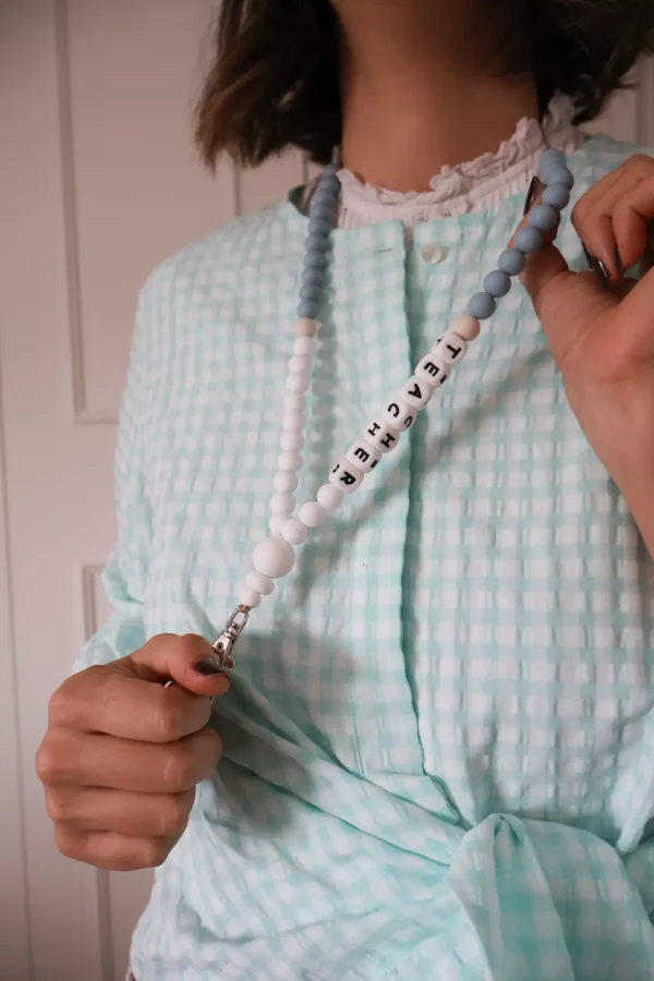 Este lanyard está diseñado para maestras y educadoras que necesitan llevar sus llaves, tarjetas o identificador de forma cómoda y segura.