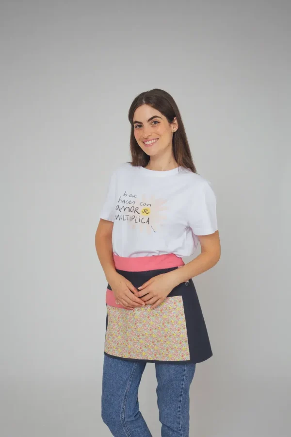 El mandil Camelia es práctico, versátil y con el encanto femenino de Floreta: ideal para maestras que buscan comodidad y estilo mientras enseñan.
